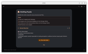 - Starting a case: From the main menu click Start New Case, pick a difficulty (Easy for 3 suspects and 2 witnesses, Hard for 5 suspects and 3 witnesses), and optionally set a theme like "Victorian London", "1950s Hollywood", or "space station". Leave it blank for a random setting.