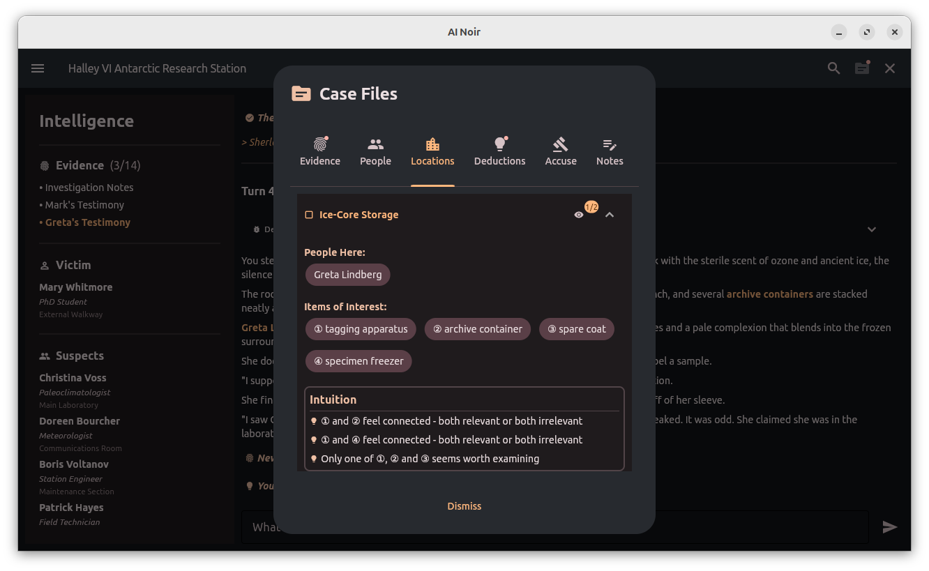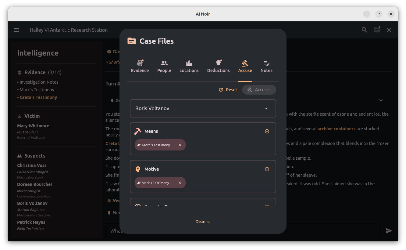 A text-based whodunit where every mystery is generated by AI. No two cases are the same. You're the detective; everyone has something to hide, but only one is a killer.