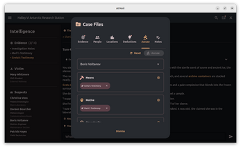 - Building your case: Open Case Files from the top bar to review evidence, people profiles, locations, deductions by suspect, and your personal notes.