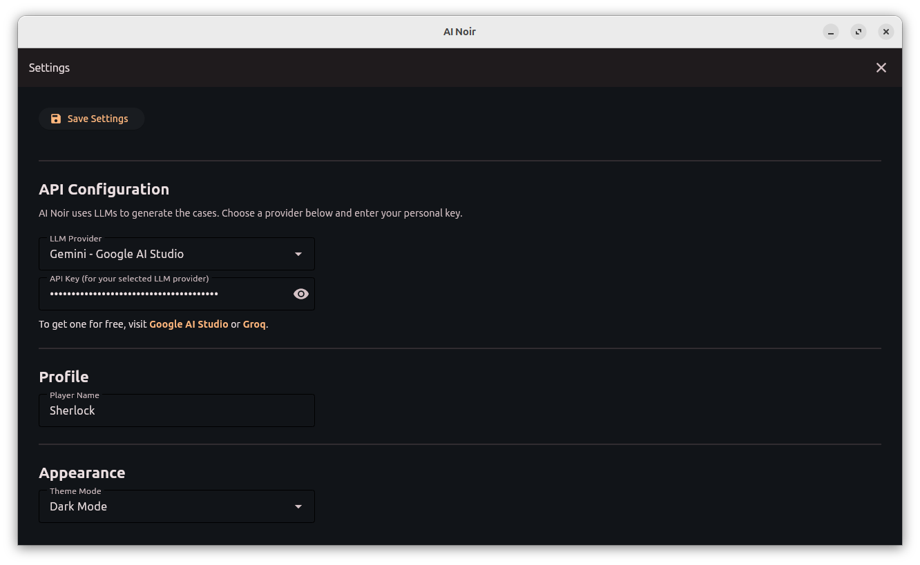 AI Noir uses LLMs to generate each case, so you'll need an API key with one of the supported providers: